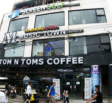 位在D'mall裡, 正門口就是摩天輪, 半開放空間沒有冷氣, 白色桌椅帶來柔和感, 若用餐時間有微風就會很享受。