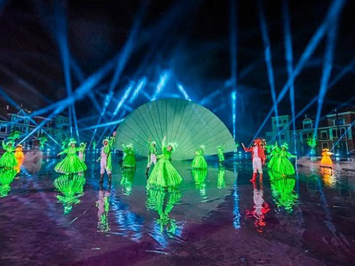 - 在每天晚上入夜後9點30分在愛湖上,就會上演一場結合光雕投影、水舞、舞蹈、音樂的「威尼斯大秀」,長達30分鐘的演出以戴著面具的宮廷貴族,乘著貢多拉出場進行海上巡禮打頭陣,穿著華麗服飾的宮廷貴族戴著代表威尼斯面具節的面具站在船上,與沿岸遊客打招呼,當一艘艘船退場,在舞台正中央正式開啟了一場華麗的宮廷演出。該劇再現了天才畫家與佳人在威尼斯河畔的浪漫愛情故事。一段相遇-相愛-分離-重逢的旅程,給觀眾帶來了諸多感慨。結合光雕投影、大型水舞,還有雷射光束,貴族們在海上舞台中央隨著音樂翩翩起舞,時而激烈、時而婉轉浪漫,最後以變化萬千的雷射投影搭配水幕帶起整場演出高潮,精彩演出成為富國島上必看三大秀。