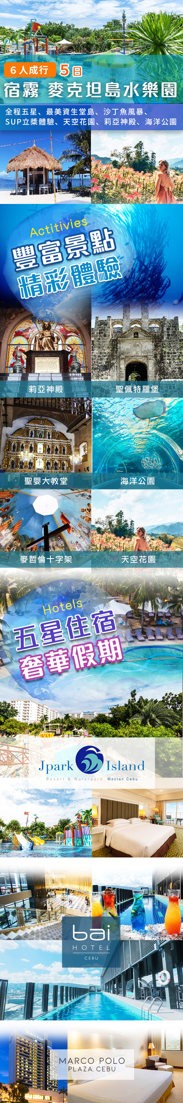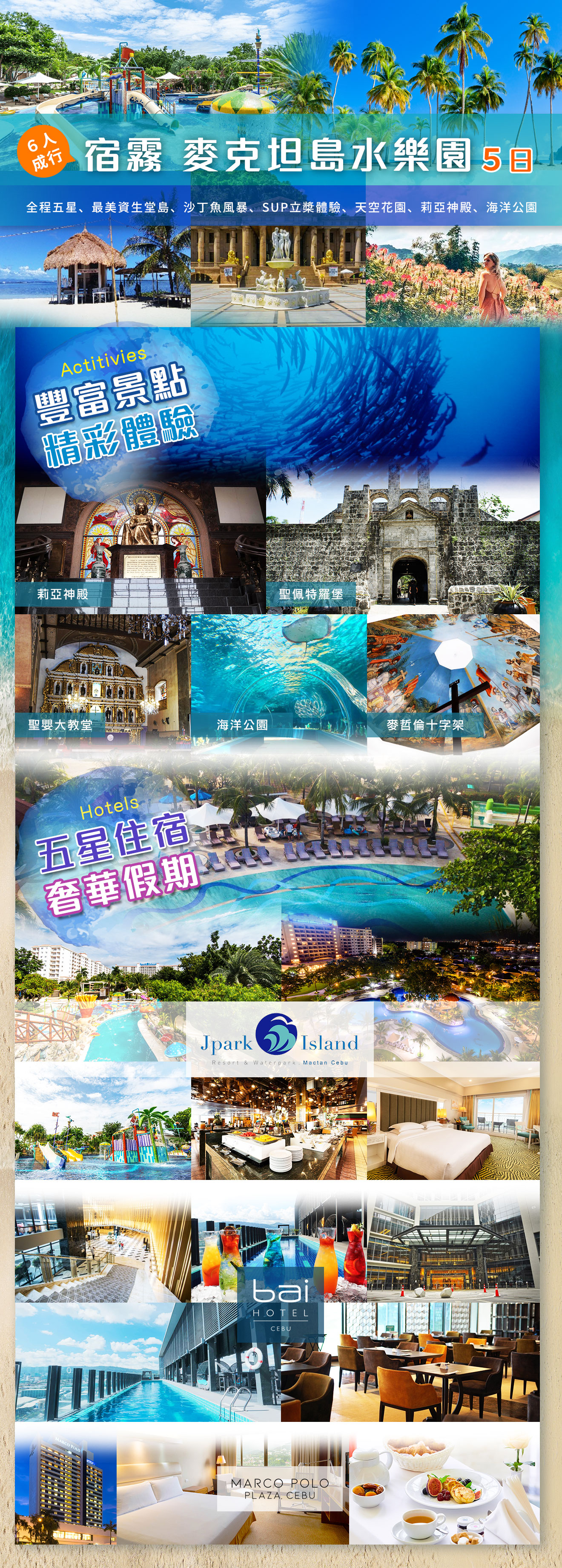 早 飯店內早餐 午 海鮮燒烤自助餐+南洋水果 P600 晚 異國創意料理 P1600 宿 JPARK Island Resort and Waterpark, Cebu 或 同級溫馨提醒: