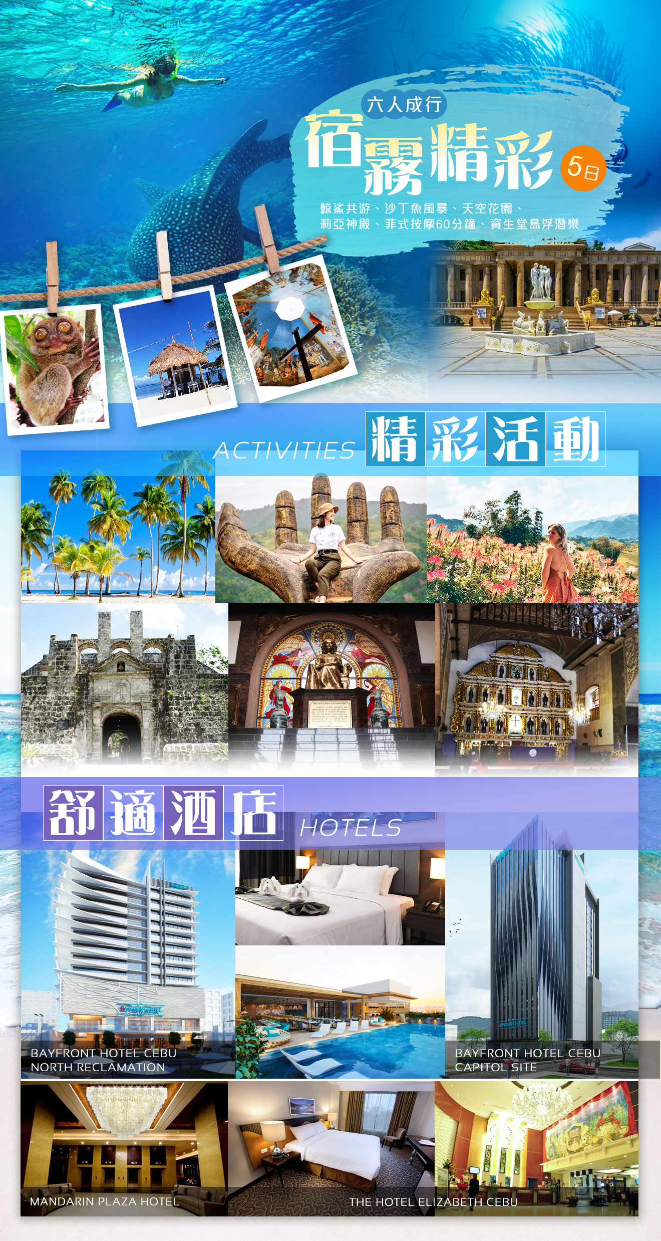- 宿霧精彩5日-鯨鯊共游、沙丁魚風暴、天空花園、莉亞神殿、菲式按摩60分鐘、資生堂島浮潛樂【6人成行】