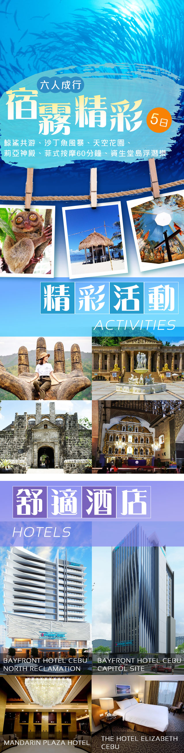 早 飯店內早餐 午 海鮮燒烤自助餐+南洋水果 P600 晚 菲式自助晚餐 P900 宿 宿霧文華大飯店 Mandarin Plaza Hotel 或 Bayfront Hotel Cebu - North Reclamation 或 Bayfront Hotel Cebu - Capitol Site 或 The Hotel Elizabeth Cebu 或 同級溫馨提醒: