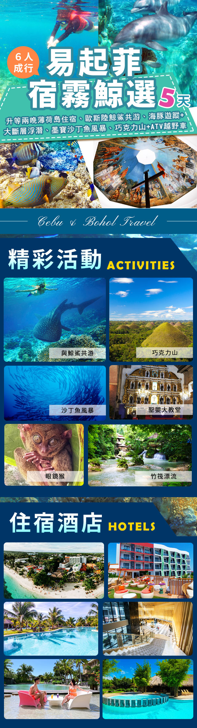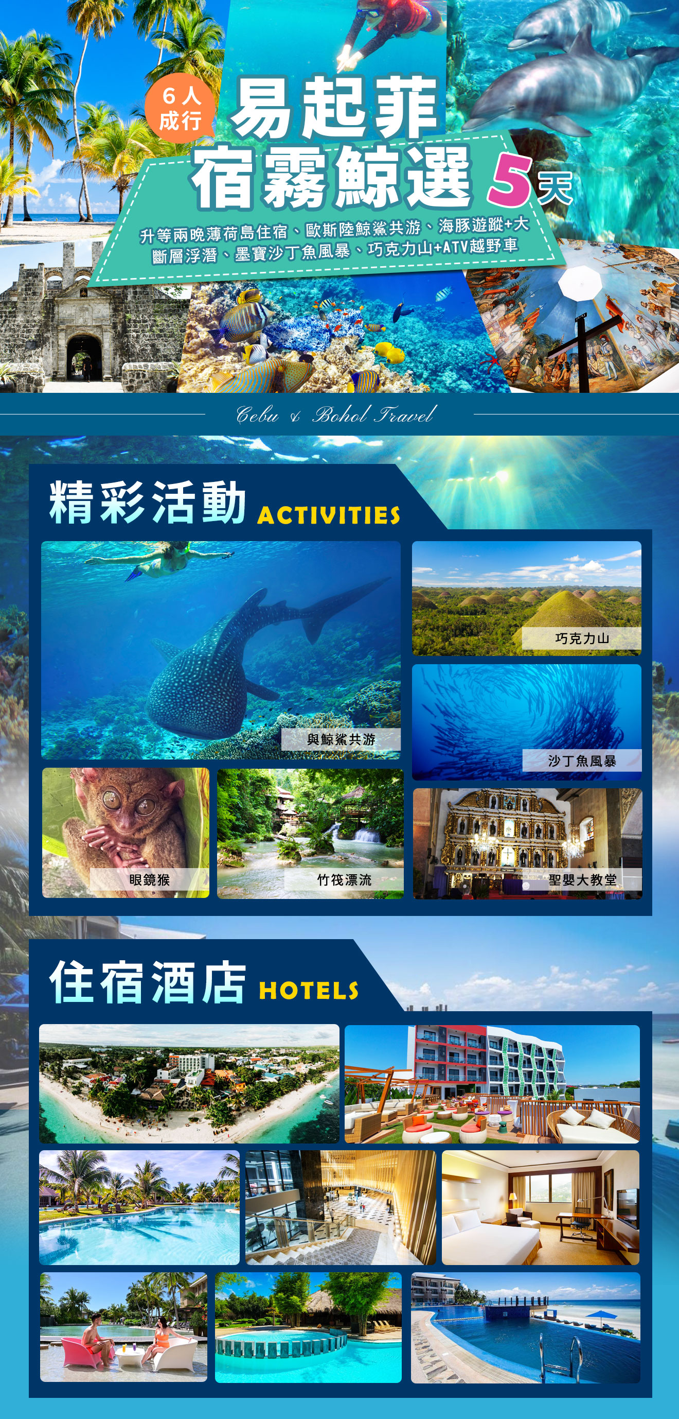 - 【易起菲宿霧鯨選5日】六人成行、升等兩晚薄荷島住宿、歐斯陸鯨鯊共游、海豚遊蹤+大斷層浮潛、墨寶沙丁魚風暴、巧克力山+ATV越野車