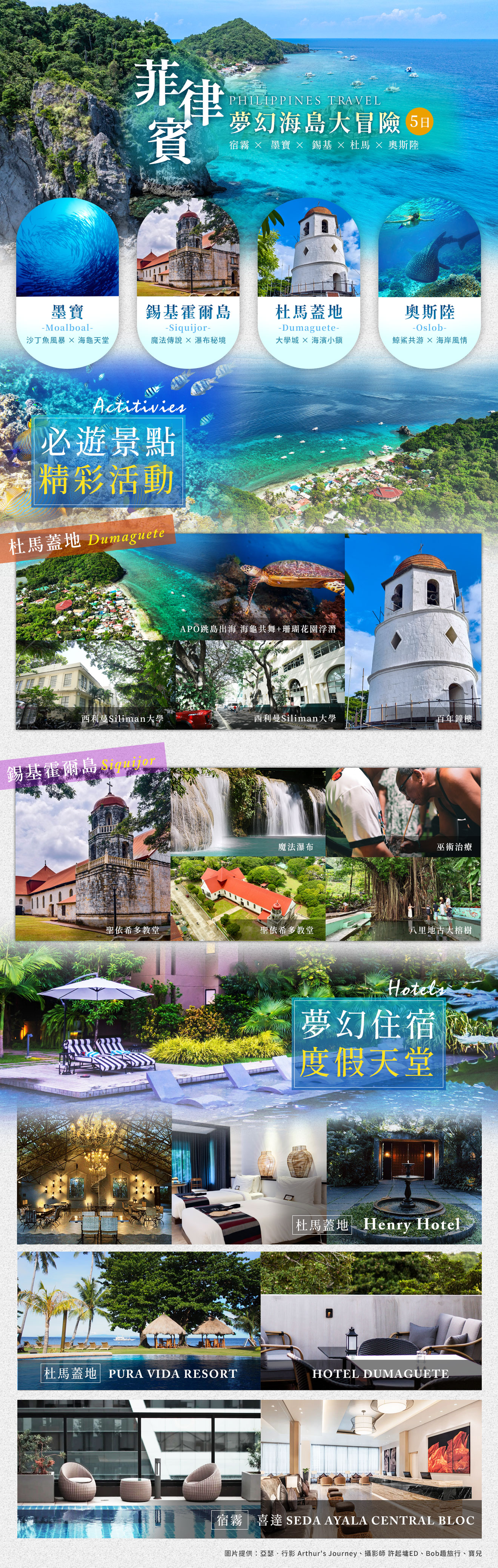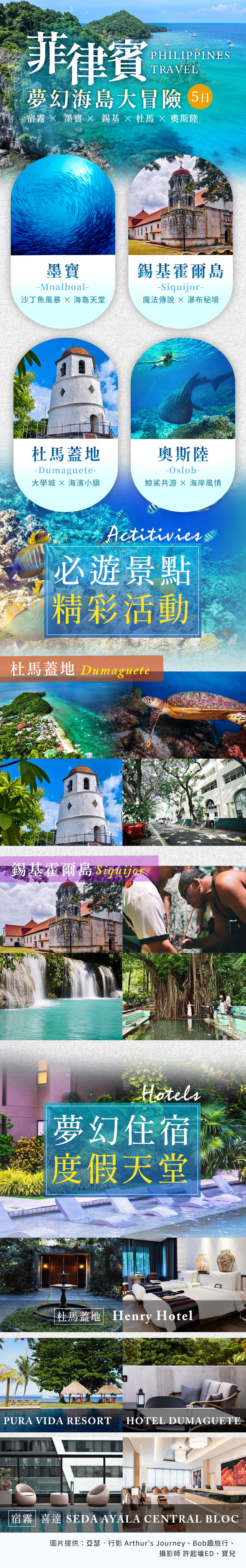 早 飯店內精緻早餐 午 景觀餐廳 P850/人 晚 異國風情料理 P850/人 宿 杜馬蓋地The Henry Resort Dumaguete (市區) 或 Pura Vida Beach & Dive Resort (海邊) 或 Hotel Dumaguete (市區) 標準房 或 同級飯店標準房※ 註: