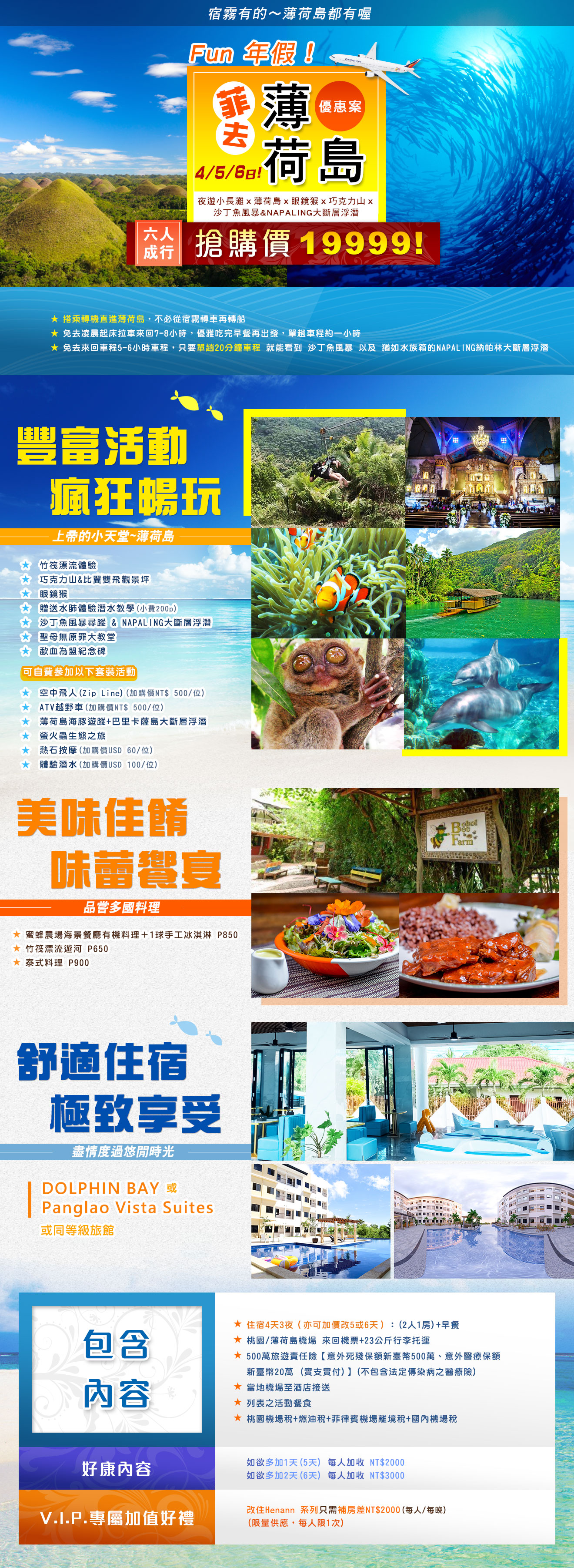 費用一覽 輕鬆Fun年假~菲去薄荷島優惠案 4/5/6日遊